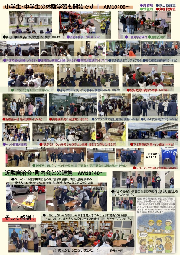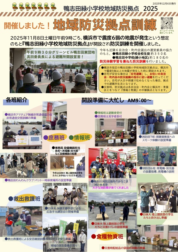 - 【2025年度】地域防災拠点訓練のご報告2025年度 防災訓練報告 チラシ作成▶︎拠点事務局 植村博之さん(グリーンヒル鴨志田西団地) 鴨志田緑小学校… 続きを読む: 【2025年度】地域防災拠点訓練のご報告